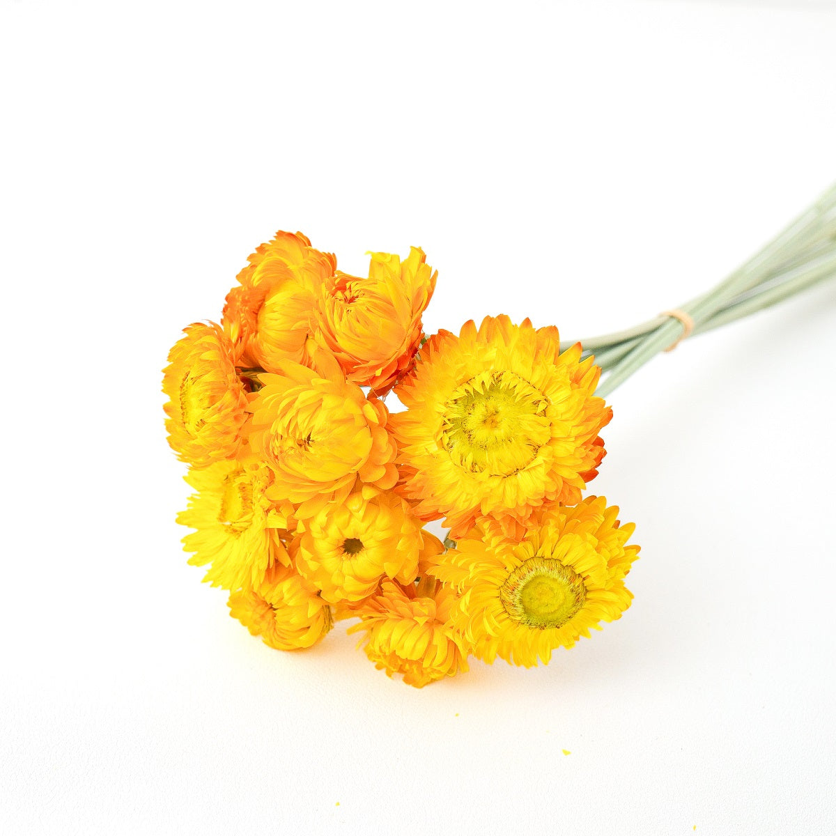 Our Helichrysum With Wheat Stems is a unique dried floral arrangement designed to bring a touch of sunshine to your space. The bunch features 9 heads of dried helichrysum flowers in a vibrant yellow hue.